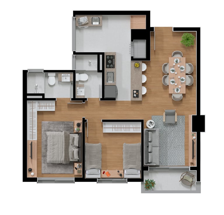 Plantas humanizadas desenvolvidas para facilitar a leitura e compreensão do projeto, destacando layout, circulação, mobiliário e uso dos espaços de forma clara e visual. Esse recurso proporciona maior entendimento dos ambientes, auxiliando na apresentação e valorização de empreendimentos.